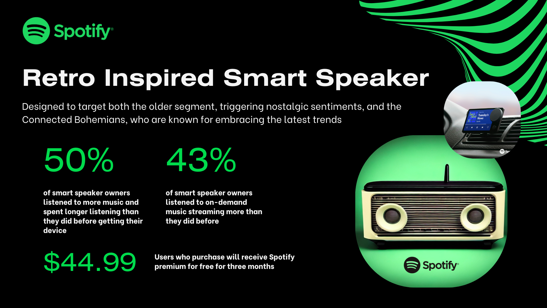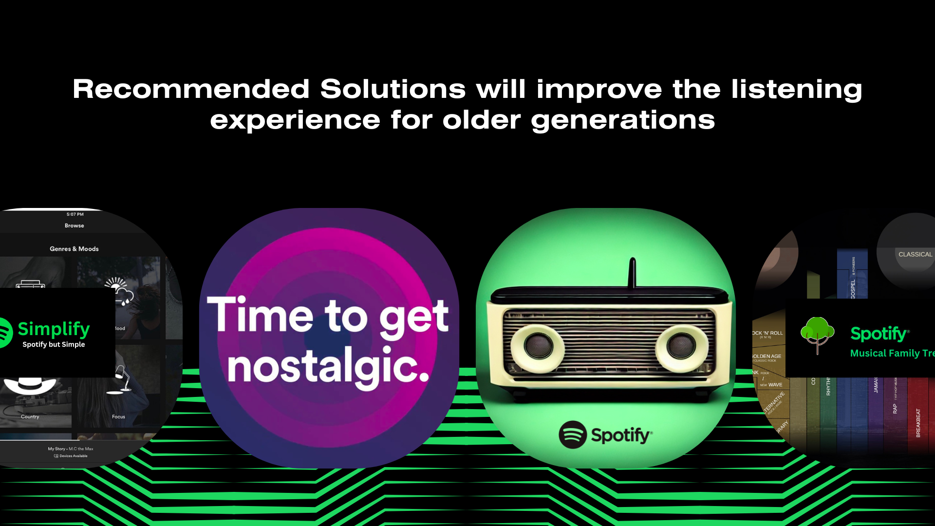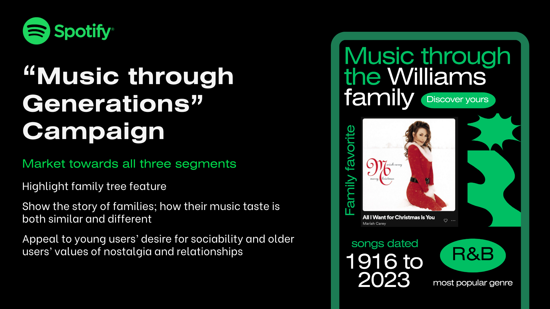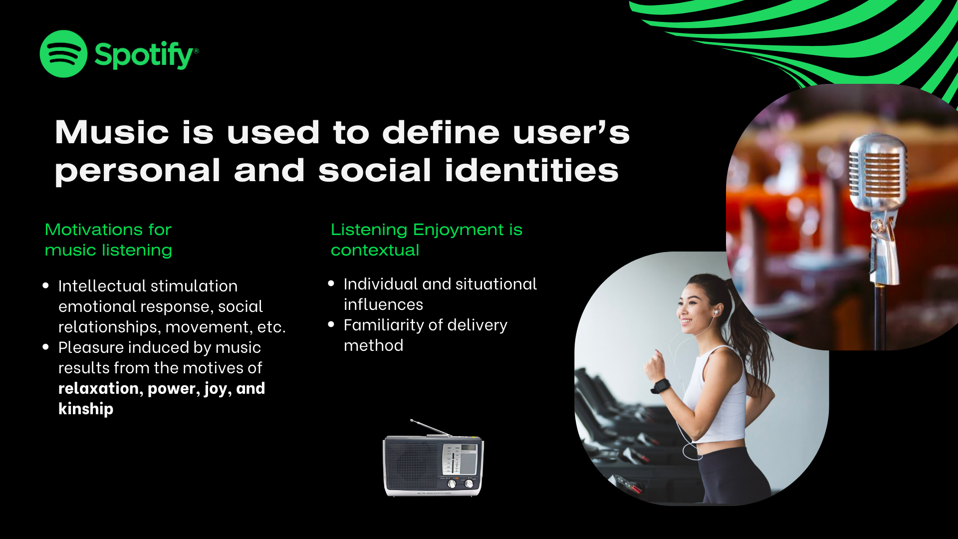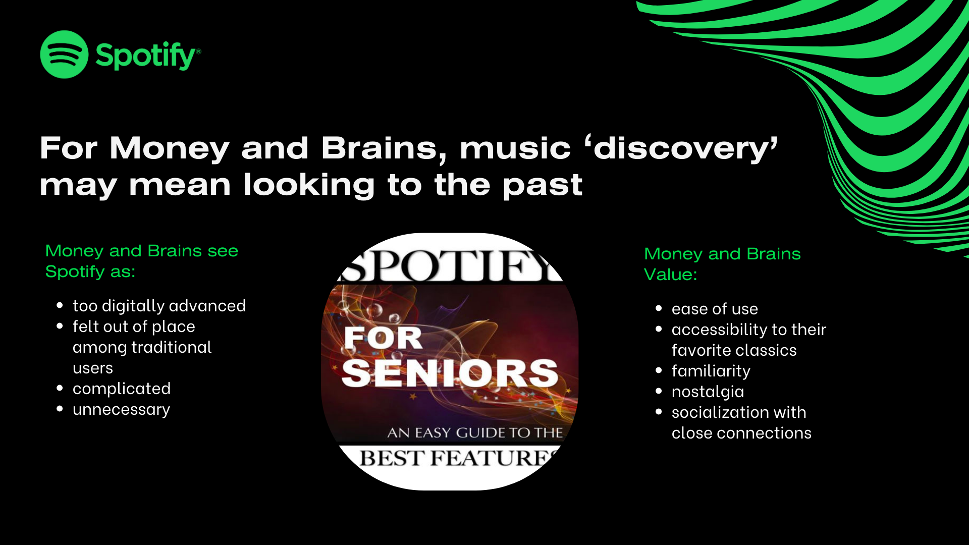 Rationale for choosing Spotify: Spotify is one of the world’s leading music streaming platforms, and its global, diverse user base of 453+ million users provides a particularly compelling subject for our consumer profile and brand analysis report. Younger customers in particular have a strong connection to the Spotify brand, using its capabilities to create playlists, share music, and connect with friends. A user’s Spotify profile harnesses valuable demographic data unique to a consumer’s personal identity, taking on a similar role as a social media platform. However, there is a gap in Spotify’s customer base, which is composed mainly of individuals under the age of 35. Our team explored why older generations are not using Spotify and what specialized features might allow them to capture this segment.
